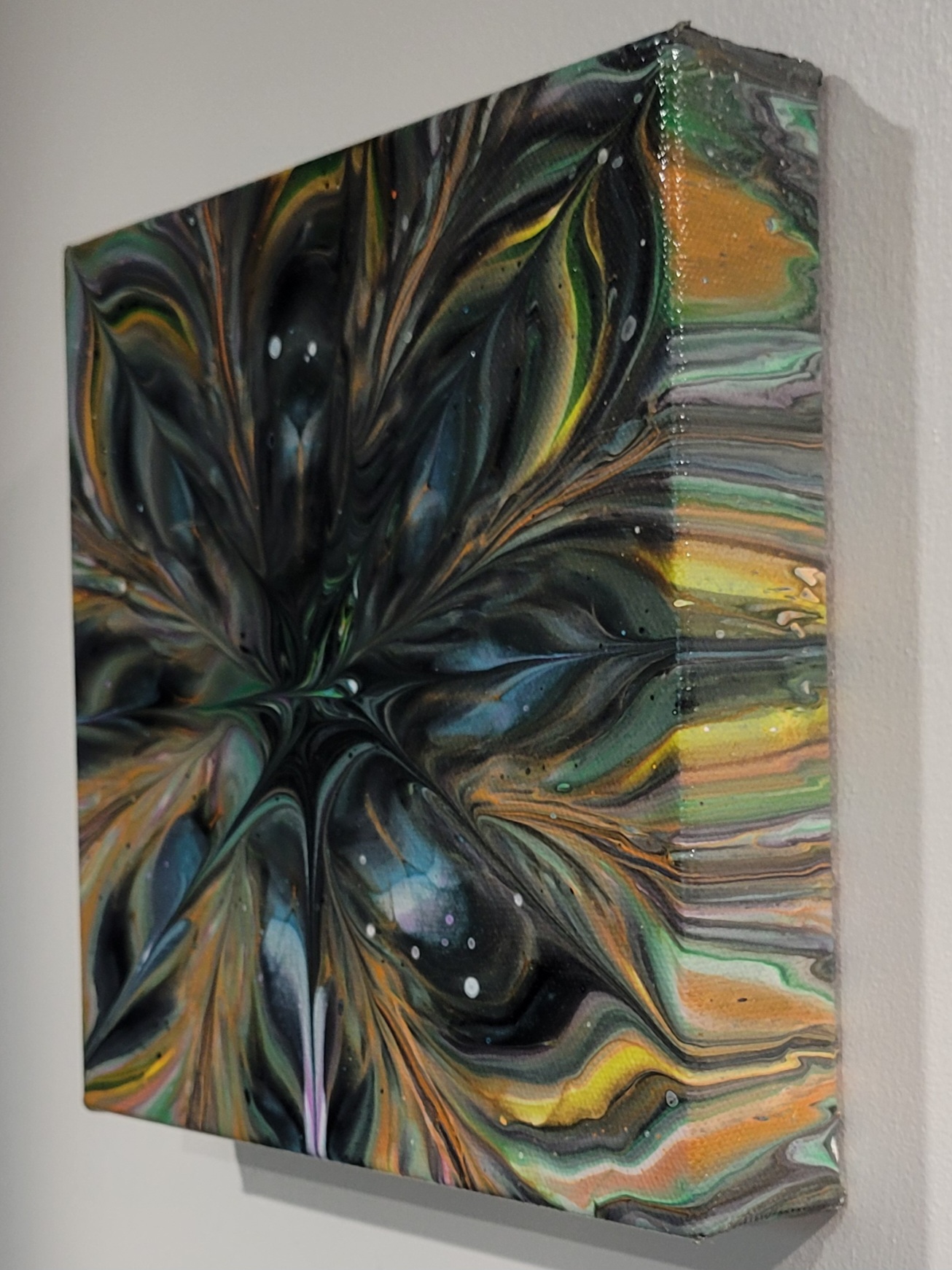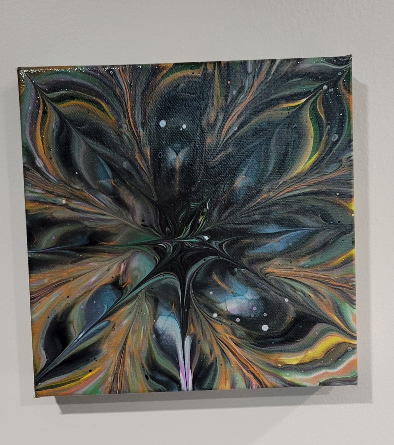 My flower cup pours are created by layering multiple fluid acrylic colors into a specialized cup. I mix my acrylic paints beforehand with pouring medium and make sure there are no bubbles using a heat device. Once I pour the paints one at a time into the cup, I lift the cup off the canvas. I use a device to make petal like creations on the canvas that spread out from the center where the cup was. I then carefully spin the canvas to spread the paint over the entire canvas and the sides. After the piece dries for 3 weeks and proves, I apply a gloss varnish to bring out it's beauty.