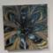 My original flower split cup pour features a symmetrical, dark, floral butterfly-like design. It is characterized by a central starburst of black, gray and teal/mint green, dramatically contrasted with warm accents of gold, orange, and yellow swirling outward. Small white and blue paint speckles (cells) add texture and depth to the dark areas.