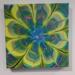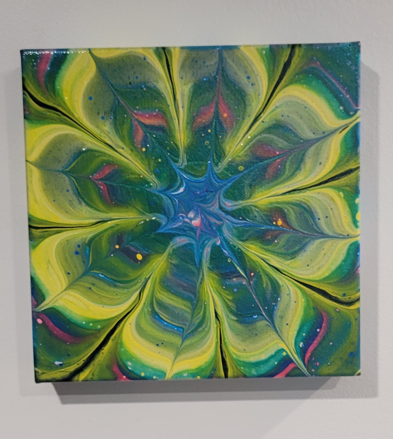 Original acrylic fluid art on canvas featuring a vibrant, starburst-inspired bloom in radiant blues, greens, and purples—celebrating motion, color, and creative energy.